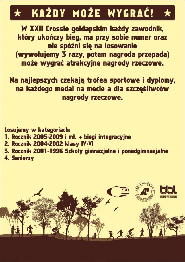 Miło nam poinformować, że podczas XXII Crossu Gołdapskiego wśród uczestników zawodów będą rozlosowane nagrody rzeczowe.