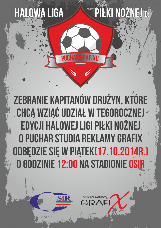 Wielkimi krokami zbliża się kolejna edycja Halowej Ligi Piłki Nożnej. Tym razem zawodnicy, którzy wezmą udział w rozgrywkach zagrają o Puchar Studia Reklamy Grafix. Zebranie kapitanów drużyn, które chcą wziąć udział w rozgrywkach odbędzie się 17 października w Ośrodku Sportu i Rekreacji o godzinie 12:00.