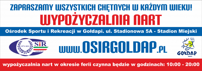 Ośrodek Sportu i Rekreacji w Gołdapi informuje, że wypożyczalnia nart biegowych w okresie ferii zimowych tj od 25 stycznia do 7 lutego czynna będzie od godziny 10:00 do 20:00. 1. Wypożyczalnia nart (narty, kije, buty) – 1 godz. – 5zł – 1 dzień – 15zł – 3 dni – 40zł – 1 tydzień – 100zł…