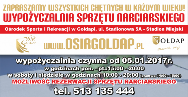 Ośrodek Sportu i Rekreacji w Gołdapi informuje, że wypożyczalnia nart biegowych oraz sprzętu narciarskiego od dnia jutrzejszego tj. 11 stycznia 2017 czynna będzie od godziny 08:00 do godziny 20:00!!! Do Państwa dyspozycji przygotowane są trasy na stadionie OSiR, na Promenadzie Zdrojowej oraz trasy o długości 1km, 1.5km oraz 3600m w lesie Kumiecie. Aby jak najdłużej…