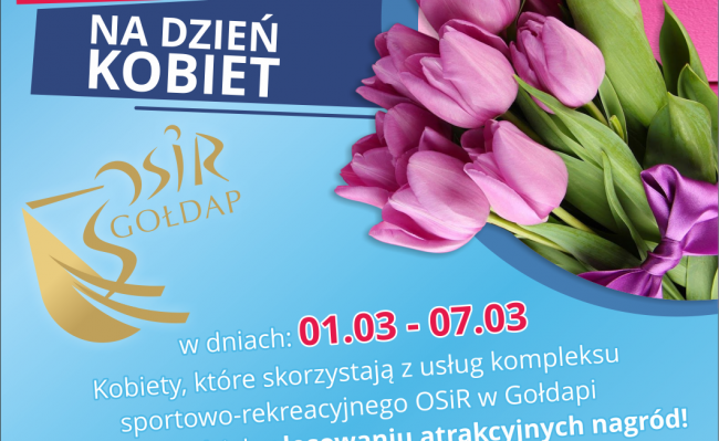 Ośrodek Sportu i Rekreacji w Gołdapi zaprasza do skorzystania z niespodzianki jaką w tym roku przygotował Ośrodek Sportu i Rekreacji z okazji Dnia Kobiet. Kobiety, które skorzystają z usług Kompleksu Sportowo Rekreacyjnego w dniach 01.03.2017 – 07.03.2017 mogą wziąć udział w losowaniu atrakcyjnych nagród 🙂