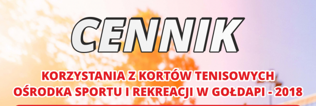 Ośrodek Sportu i Rekreacji w Gołdapi informuje, że od dnia 14 kwietnia 2018 dostępne będą dla Państwa dwa korty tenisowe zlokalizowane przy ul.Stadionowej 5A. Karnety do nabycia w biurze OSiR w dniach od poniedziałku do piątku w godzinach 7:00 – 15:00. Szczegóły na plakacie. Zapraszamy do korzystania z naszych usług.