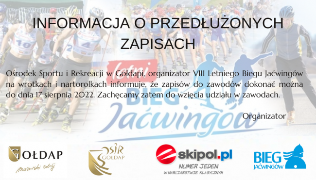 Jeszcze raz zachęcamy do wzięcia udziału w VIII Letnim Biegu Jaćwingów. Jesteśmy pewni, że jest jeszcze wiele zawodniczek, wielu zawodników, którzy nie są zapisani na organizowane przez nas wydarzenie. Na dzień dzisiejszy udział w sobotnich zawodach zgłosiło … Zgłoszenia wciąż otwarte! https://www.e-gepard.eu
