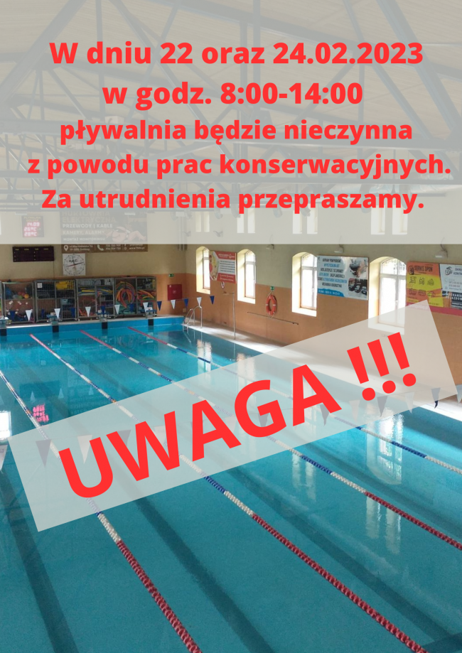 W dniu jutrzejszym 22.02 oraz 24.02 w godz. 8:00-14:00 pływalnia będzie nieczynna. Za utrudnienia przepraszamy.