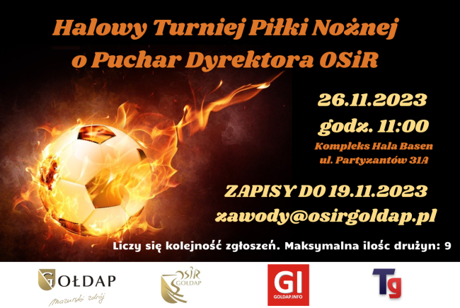 Zapraszamy wszystkich miłośników piłki nożnej do zapisów swoich drużyn na Halowy Turniej Piłki Nożnej o Puchar Dyrektora OSiR , który odbędzie 26.11.2023 o godz.11:00 w Kompleksie Hala – Basen ul. Partyzantów 31A. Zapisy drużyn przyjmujemy pod adresem : zawody@osirgoldap.pl do dnia 19.11.2023 Halowy turniej piłki nożnej 2023 – Regulamin Halowy-Turniej-Pilki-Noznej-zgloszenie-druzyny Halowy-Turniej-Pilki-Noznej-formularz-zgloszeniowy-klauzula-i-zgody-dorosli (1)