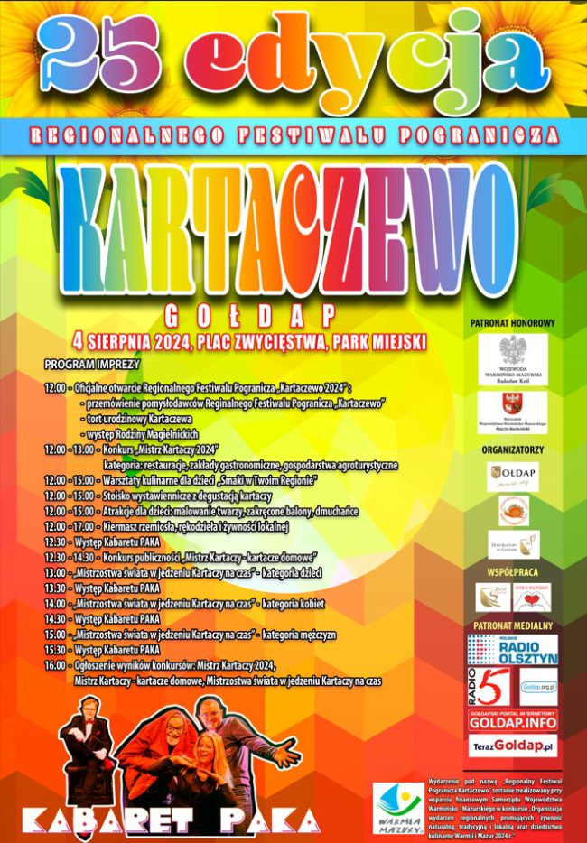 Już 4 sierpnia w samym centrum #GołdapMazurskiZdrój odbędzie się edycja Regionalnego Festiwalu Pogranicza #Kartaczewo Zapraszamy na warsztaty kulinarne dla dzieci „Smaki w Twoim Regionie” oraz przygotowane zostanie stoisko wystawiennicze z degustacją kartaczy Nie zabraknie atrakcji dla dzieci i dorosłych. Zawita do nas Wakacyjna akcja Eska Summer City. W parkowych alejkach umiejscowione będą stoiska wystawców z…