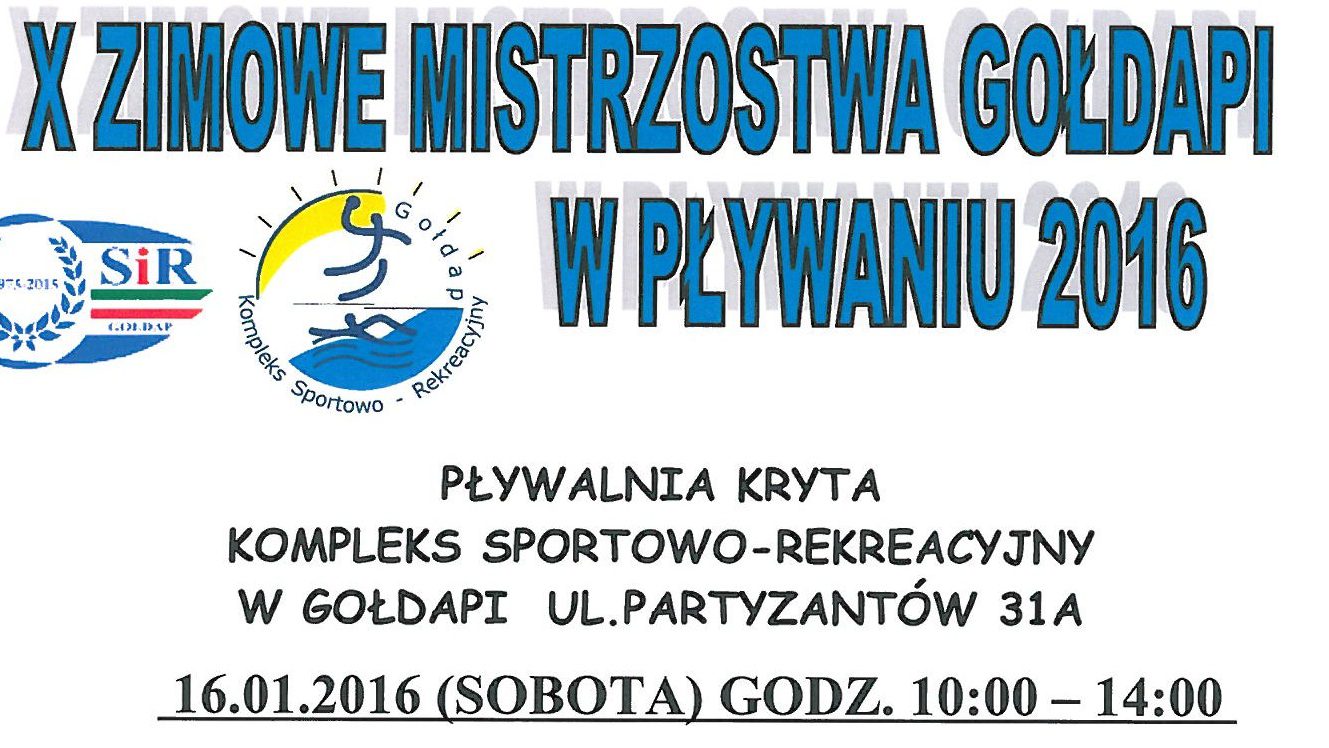 W sobotę 16 stycznia od godziny 10:00 na pływalni Kompleksu Hala-Basen odbędą się X Zimowe Mistrzostwa Gołdapi w Pływaniu. Serdecznie zapraszamy do wzięcia udziału w zawodach i kibicowania. Szczegóły pod numerem telefonu 87-615-40-10