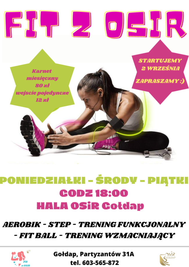 Od 2 września ruszają zajęcia FITNESS Serdecznie zapraszamy wszystkie chętne osoby na zajęcia, które odbywać się będą w Hala-Basen Gołdap,  w każdy poniedziałek, środę oraz piątek o godzinie 18:00. Jeśli jeszcze nie próbowałaś, to właśnie teraz nadszedł czas aby popracować nad formą ZAPRASZAMY