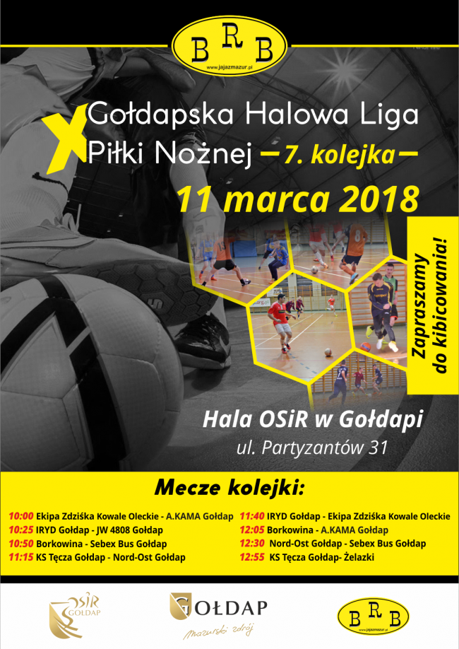 VII kolejka Gołdapskiej Halowej Ligi Piłki Nożnej RBB JAJA Z MAZUR rozegrana zostanie w niedzielę 11 MARCA 2018 w hali OSiR. Zapraszamy do kibicowania.