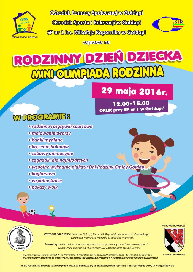 Serdecznie zapraszamy na Rodzinny Dzień Dziecka, który odbędzie się w dniu 29 maja 2016 na boisku ORLIK przy Szkole Podstawowej nr.1 🙂 Zabawy integracyjne poprowadzą Panie: Anna Jurczyk i Emilia Ginel z Domowego Punktu Przedszkolnego Nibylandia w Gołdapi!