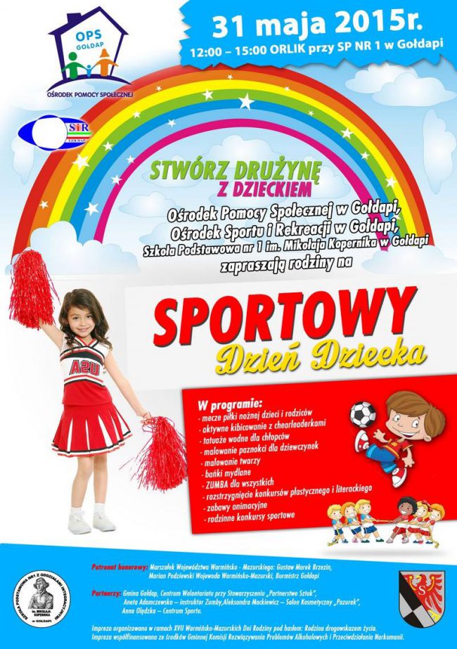 OPS, OSiR i Szkoła Podstawowa nr 1 zapraszają rodziny do wspólnej zabawy podczas Sportowego Dnia Dziecka. Impreza odbędzie się na gołdapskim orliku 31 maja. Szczegóły na plakacie.