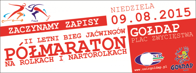 Letni Bieg Jaćwingów II Półmaraton w Jeździe Szybkiej Na Rolkach i Nartorolkach odbędzie się 9 sierpnia w Gołdapi. Początek zawodów o godzinie 12.00. Start i meta umiejscowione będą w centrum miasta przy Urzędzie Miejskim. Więcej informacji już wkrótce. Zapraszamy do zapisów. Przedstawiamy regulamin Letniego Biegu Jaćwingów. Regulamin Półmaratonu Na Rolkach i Nartorolkach