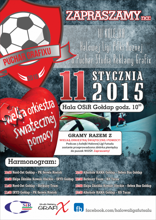wyniki, tabela i strzelcy bramek po trzeciej kolejce Halowej Ligi Futsalu o Puchar Studia Reklamy Grafix Za nami trzecia kolejka Halowej Ligi Futsalu o Puchar Studia Reklamy „GRAFIX”, w której zostało rozegranych osiem spotkań. Nastąpiła zmiana na pozycji lidera, którą po dzisiejszej kolejce obejmuje drużyna SEBEX BUS GOŁDAP. Na drugie miejsce awansowała drużyna KS TĘCZA,…