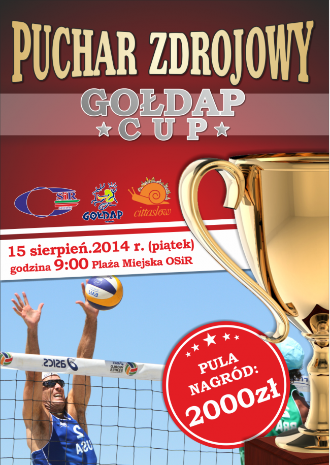 Ośrodek Sportu i Rekreacji w Gołdapi organizuje rozgrywki pod nazwą Puchar Zdrojowy w Siatkówce Plażowej „GOŁDAP CUP 2014”. Turniej odbędzie się w 15 sierpnia (piątek) na boiskach przy Plaży Miejskiej w Gołdapi. Początek o godz. 9.00. Puchar Zdrojowy GOŁDAP CUP 2014. Pula nagród to 2000zł. Oświadczenie Zawodnika Puchar Zdrojowy 2014 – regulamin