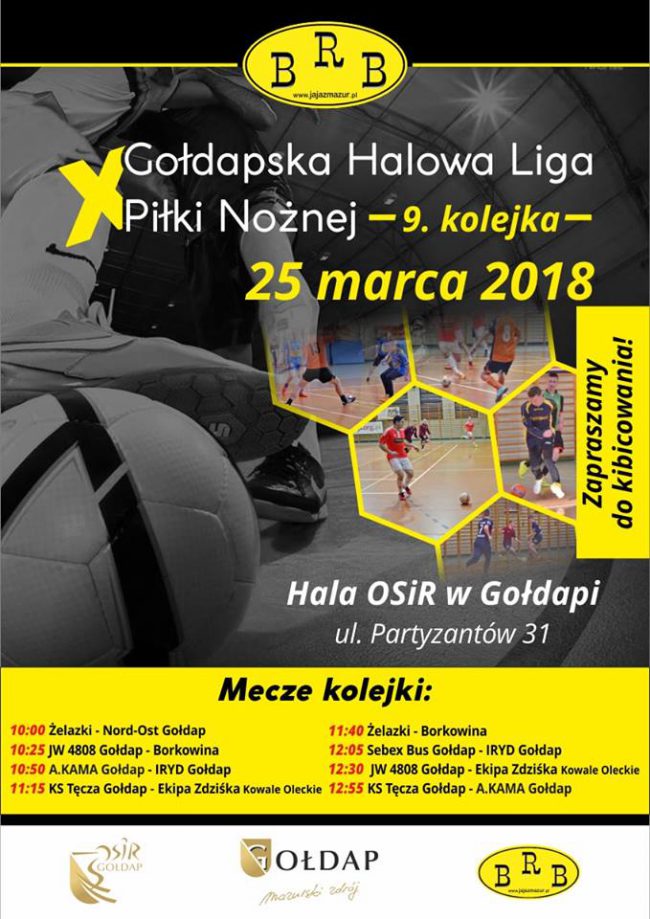 Zakończyła się X edycja Gołdapskiej Halowej Ligi Piłki Nożnej rozgrywana o puchar właściciela „RBB JAJA Z MAZUR”. Spotkania, które rozgrywane były w hali Ośrodka Sportu i Rekreacji od grudnia 2017 do marca 2018 dostarczały kibicom wiele emocji. Najlepszą drużyną X edycji okazała się ekipa SEBEX BUS GOŁDAP (obrona tytułu). Drugie miejsce przypadło drużynie EKIPA ZDZIŚKA…