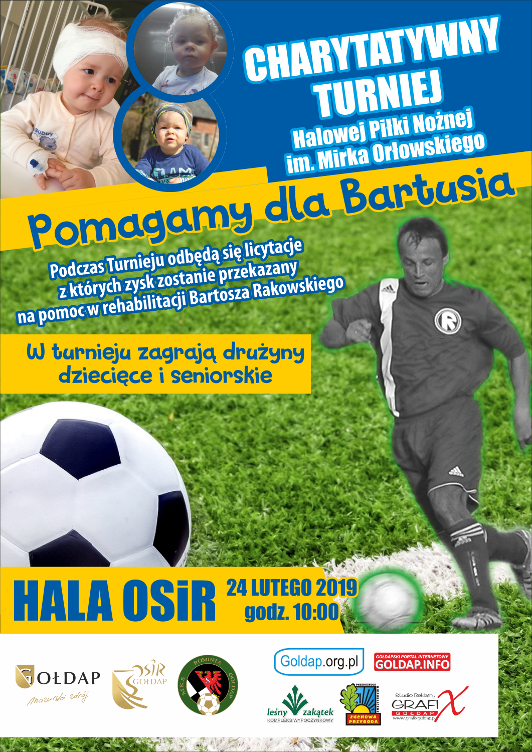 Pomaganie jest fajne ♥️ Serdecznie zapraszamy 24 lutego do hali OSiR na Charytatywny Turniej Halowej Piłki Nożnej im. Mirka Orłowskiego „Pomagamy dla Bartusia”. Podczas turnieju odbędą się licytacje, z których całkowity dochód zostanie przekazany na rehabilitację Bartusia, a może i coś więcej 👍 Szczegóły na plakacie.
