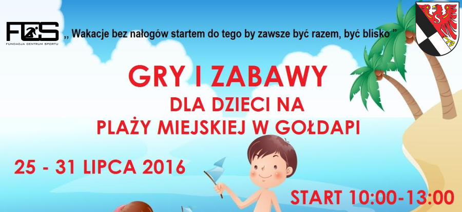 Fundacja Centrum Sportu Serdecznie Zaprasza na gry i zabawy dla dzieci na plażę miejską w Gołdapi. 25 – 31 lipca 2016 r . Od godziny 10:00 do 13:00. Uczestnikiem może być każdy nie zależnie od wieku. Uczestnicy animacji plażowych nie muszą się zapisywać mogą przyjść