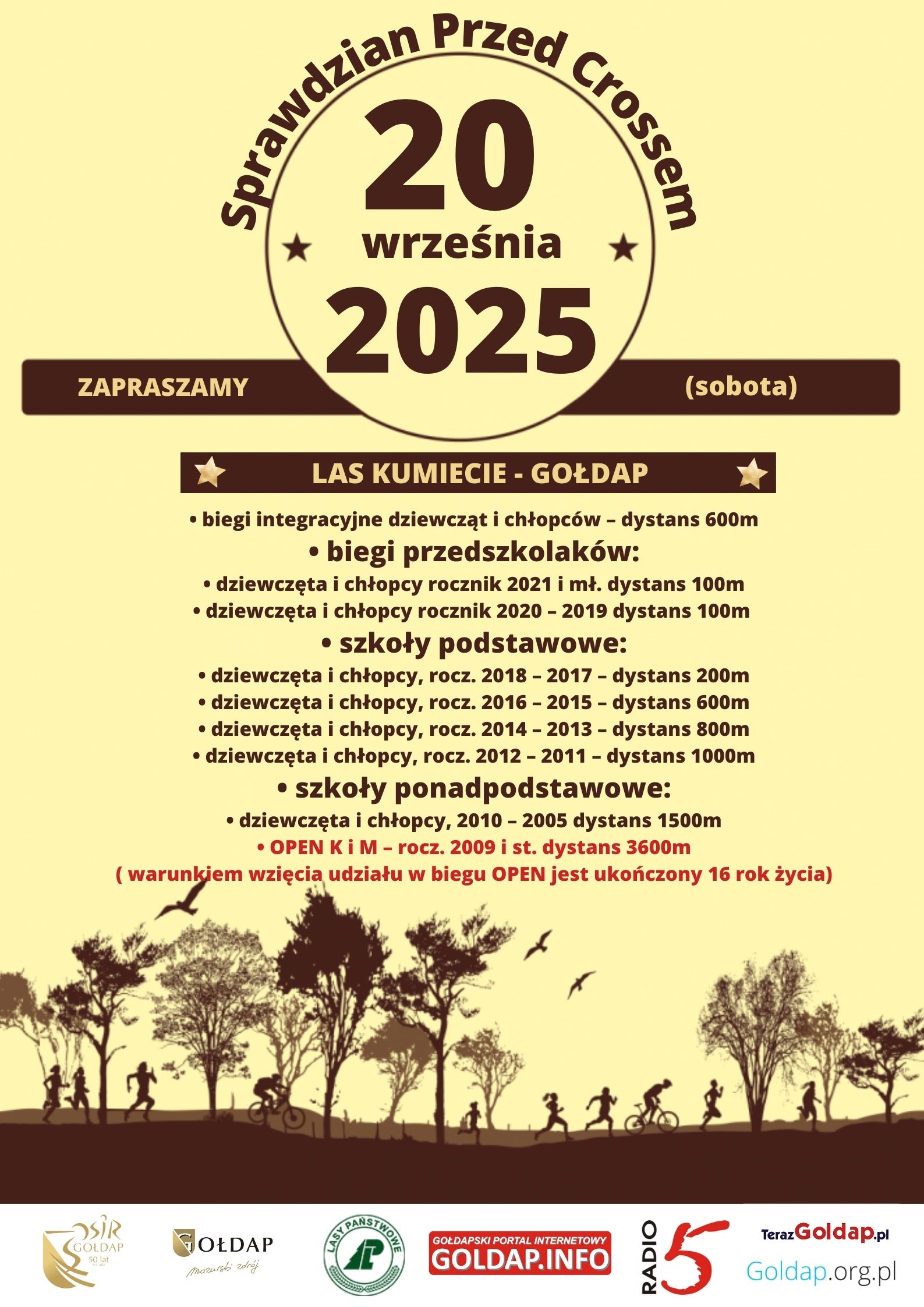 Już 20 września na malowniczych trasach w lesie Kumiecie odbędą się pierwsze zawody biegowe w roku szkolnym 2025/2026 – „Sprawdzian Przed Crossem”. Będzie to zarazem I rzut Gołdapskiej Ligi Biegów Przełajowych z 4 zaplanowanych.