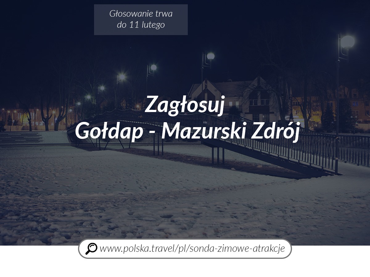 Oddaj głos na Gołdap – Mazurski Zdrój Zapraszamy do zabawy w kolejnej sondzie Polskiej Organizacji Turystycznej. Tym razem dotyczy ona wyboru atrakcji na zimę. W województwie Warmińsko-Mazurskim zostały przedstawione trzy atrakcje, w tym Gołdap. Zapraszamy do głosowania i dziękujemy za każdą Waszą rekomendację. Głosować można codziennie do 11 lutego 2020 roku. https://www.polska.travel/pl/sonda-zimowe-atrakcje?fbclid=IwAR0sFUA0OkvzcM0__i53n1prkD_FJzOcSZYfJqzsDc-MmB6DD-kcbqYNDZI
