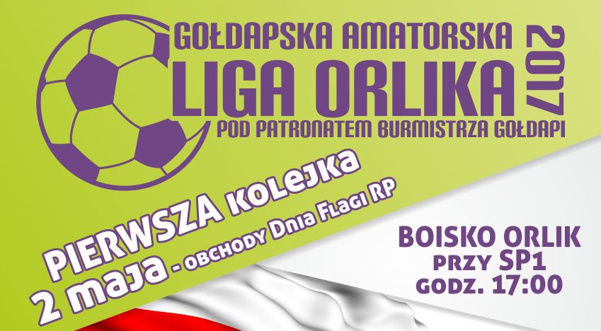 2 maja na Orliku przy SP 1 w Gołdapi rozegrana zostanie pierwsza kolejka II Edycji Gołdapskiej Amatorskiej Ligi Orlika, która rozegrana zostanie pod Patronatem Burmistrza Gołdapi. Do rozgrywek zgłosiło się 6 drużyn: