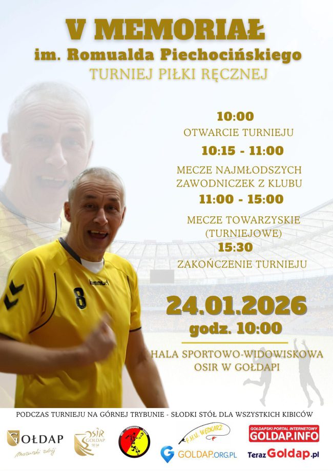 Zapraszamy zawodników, kibiców i sympatyków piłki ręcznej do wspólnego upamiętnienia Romualda Piechocińskiego i przeżycia sportowych emocji 24 stycznia 2026 r. (sobota) Start: godz. 10:00 Hala Sportowo-Widowiskowa OSiR w Gołdapi W programie: otwarcie turnieju mecze najmłodszych zawodniczek mecze towarzyskie (turniejowe) zakończenie i podsumowanie wydarzenia Podczas turnieju na górnej trybunie słodki stół dla wszystkich kibiców.
