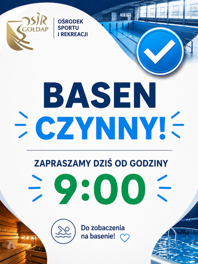 Po przerwie technicznej basen został ponownie otwarty i od dziś jest dostępny. Zapraszamy wszystkich chętnych do skorzystania z pływalni już od godziny 9:00. To doskonała okazja, aby wrócić do regularnych treningów, aktywnie spędzić czas lub po prostu zrelaksować się w wodzie. Zachęcamy do odwiedzin i korzystania z oferty basenu. Do zobaczenia!