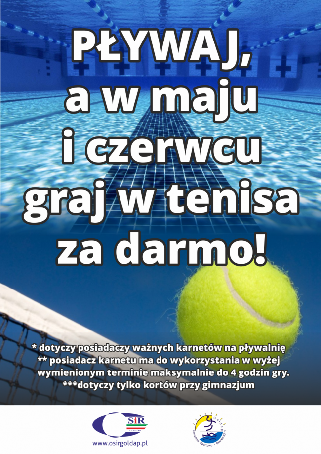 Kompleks Hala -Basen OSiR zaprasza do skorzystania z promocji jaka została przygotowana dla wszystkich, którzy posiadają lub nabędą karnet na pływalnię. Każdy właściciel takiego karnetu otrzymuje w prezencie darmowe wejścia na korty tenisowe przy gimnazjum. Więcej informacji na plakacie oraz w recepcji Kompleksu i pod numerem telefonu 876-154-010.