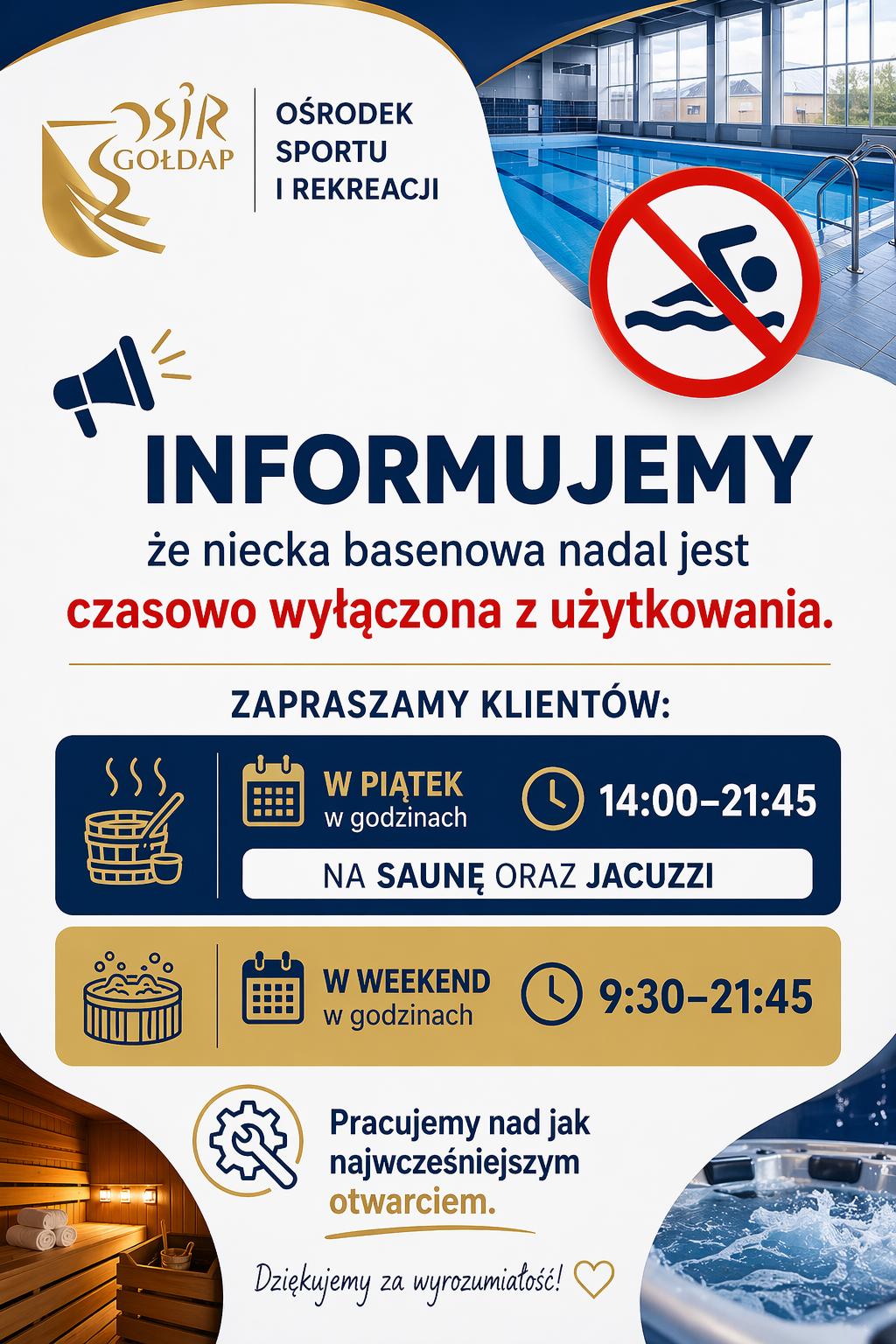 Ośrodek Sportu i Rekreacji informuje, że niecka basenowa nadal pozostaje wyłączona z użytkowania.